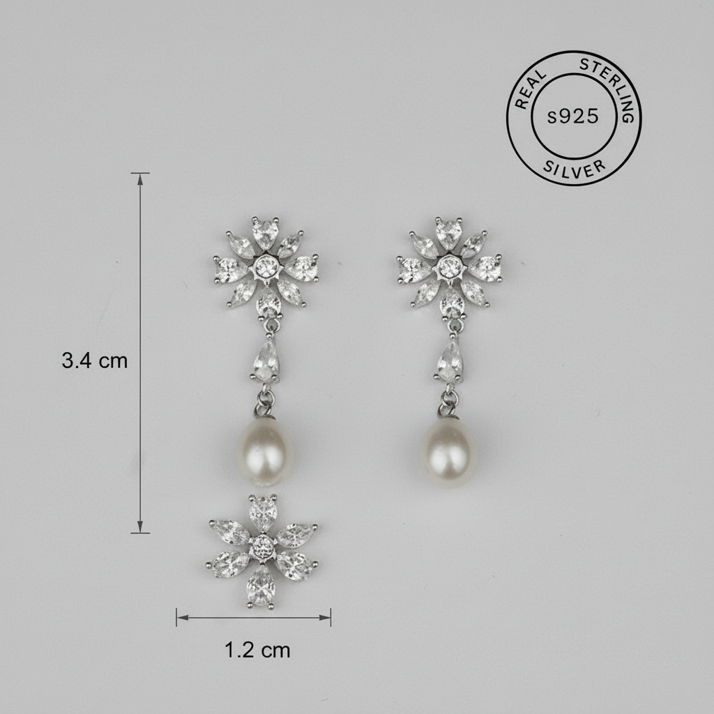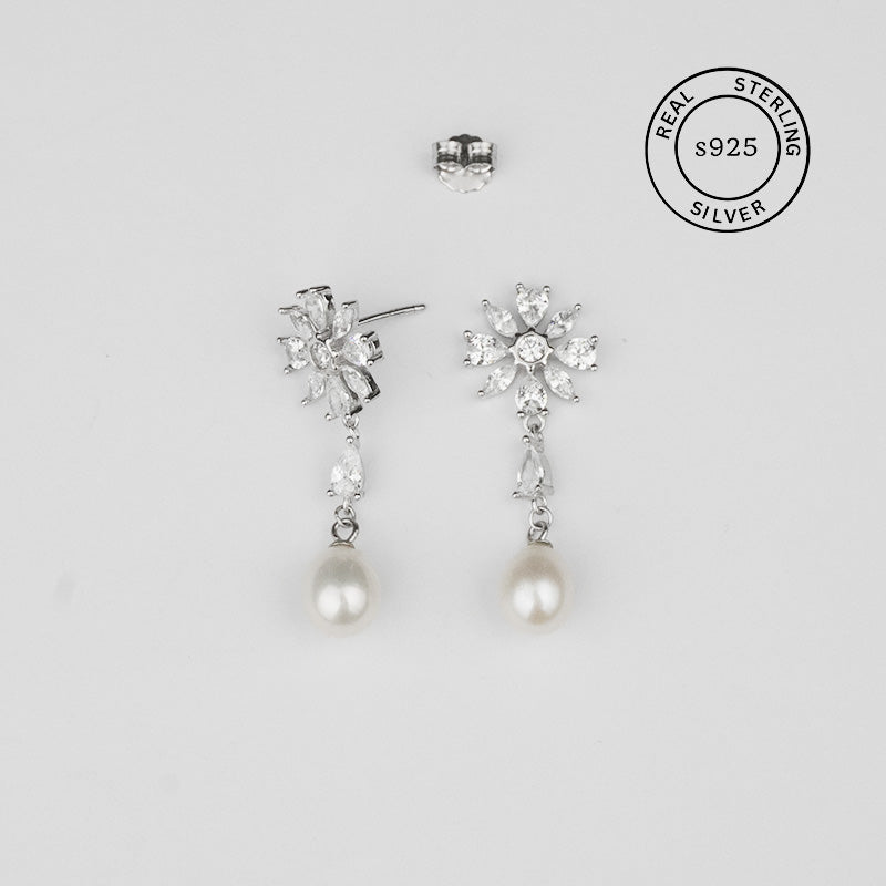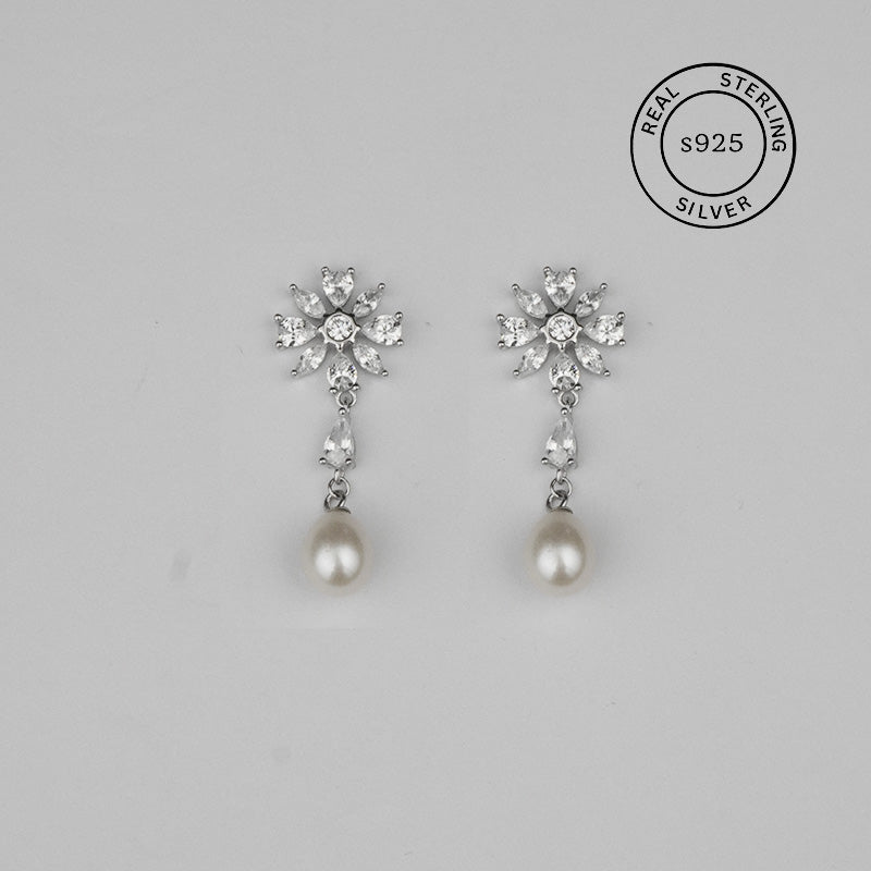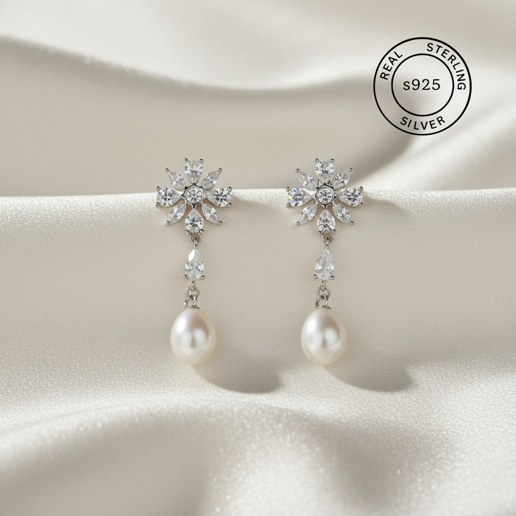 Dazzling floral design with zircon crystals in a romantic rose gold finish. Finished with a lustrous pearl drop for a touch of vintage glam. Ideal for festive wear, weddings, and elegant evening looks.
