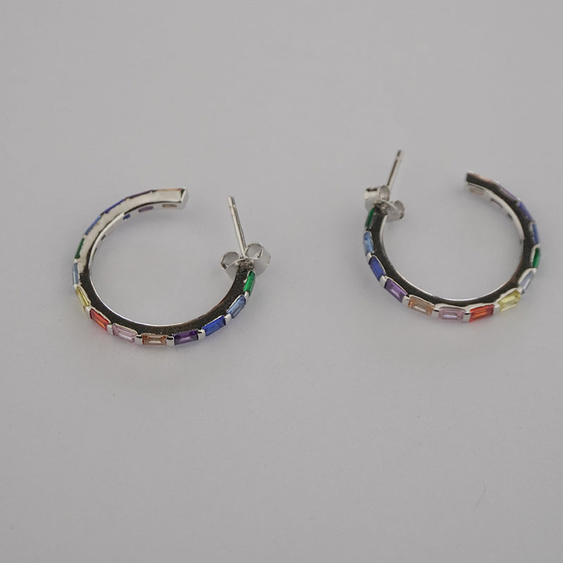 Vibrant 925 sterling silver hoop earrings accented with multicolour baguette-cut stones for a playful yet polished look. Lightweight and eye-catching, these hoops add a joyful pop of colour to everyday outfits or festive styling.