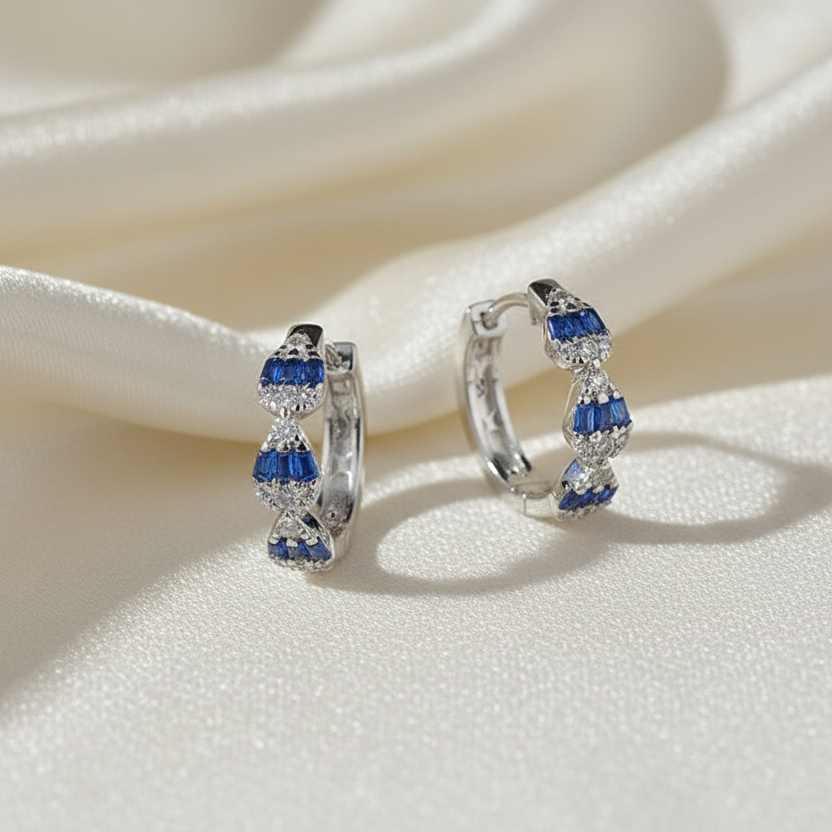 Crafted in pure 925 sterling silver, these elegant hoop earrings feature a crown-style design with deep blue stones and sparkling clear accents. Lightweight, skin-safe, and perfect for everyday elegance or special occasions.