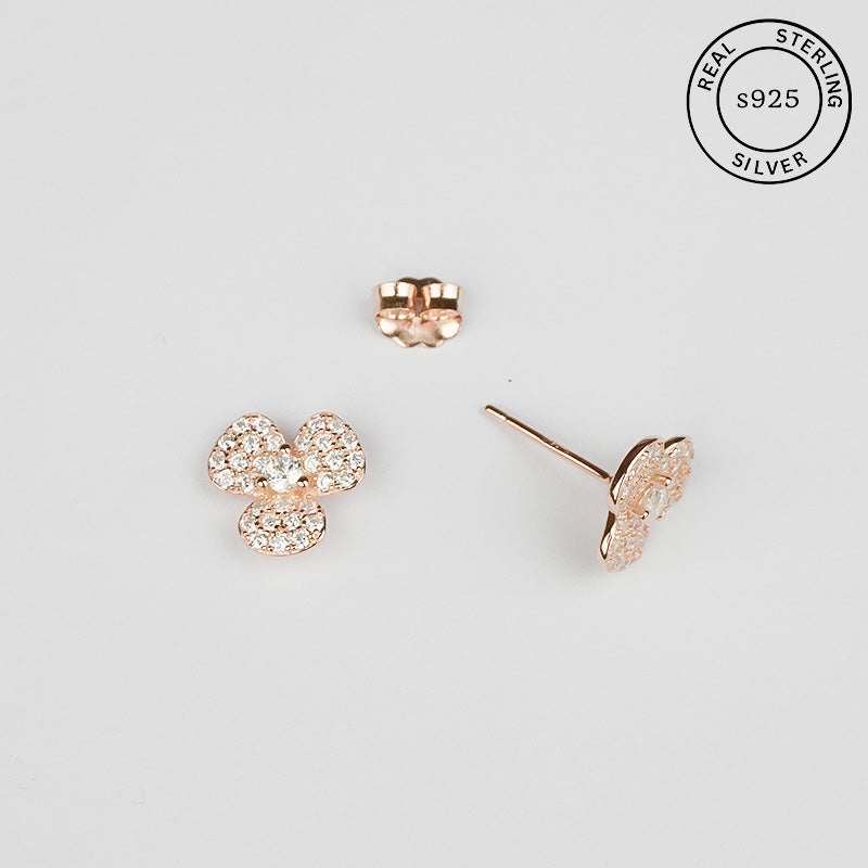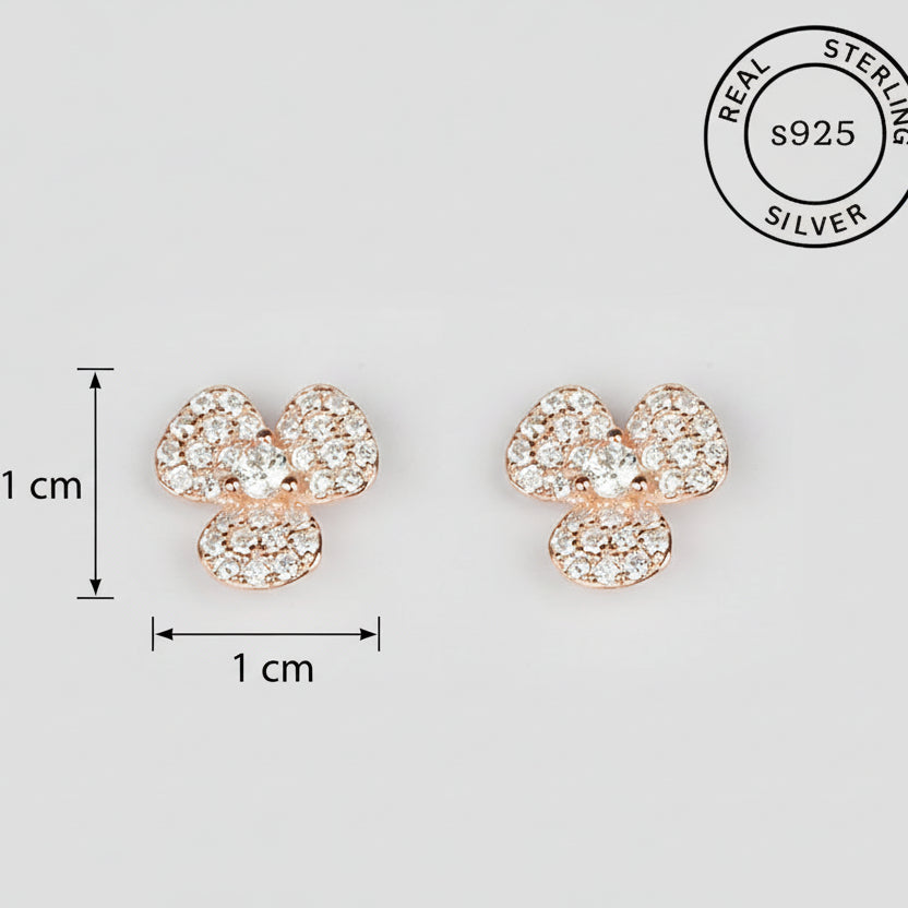 Inspired by delicate floral beauty, these 925 sterling silver earrings feature a charming pave-set cubic zirconia flower design. The rose gold finish adds a soft, feminine touch, making them perfect for both everyday elegance and special occasions.