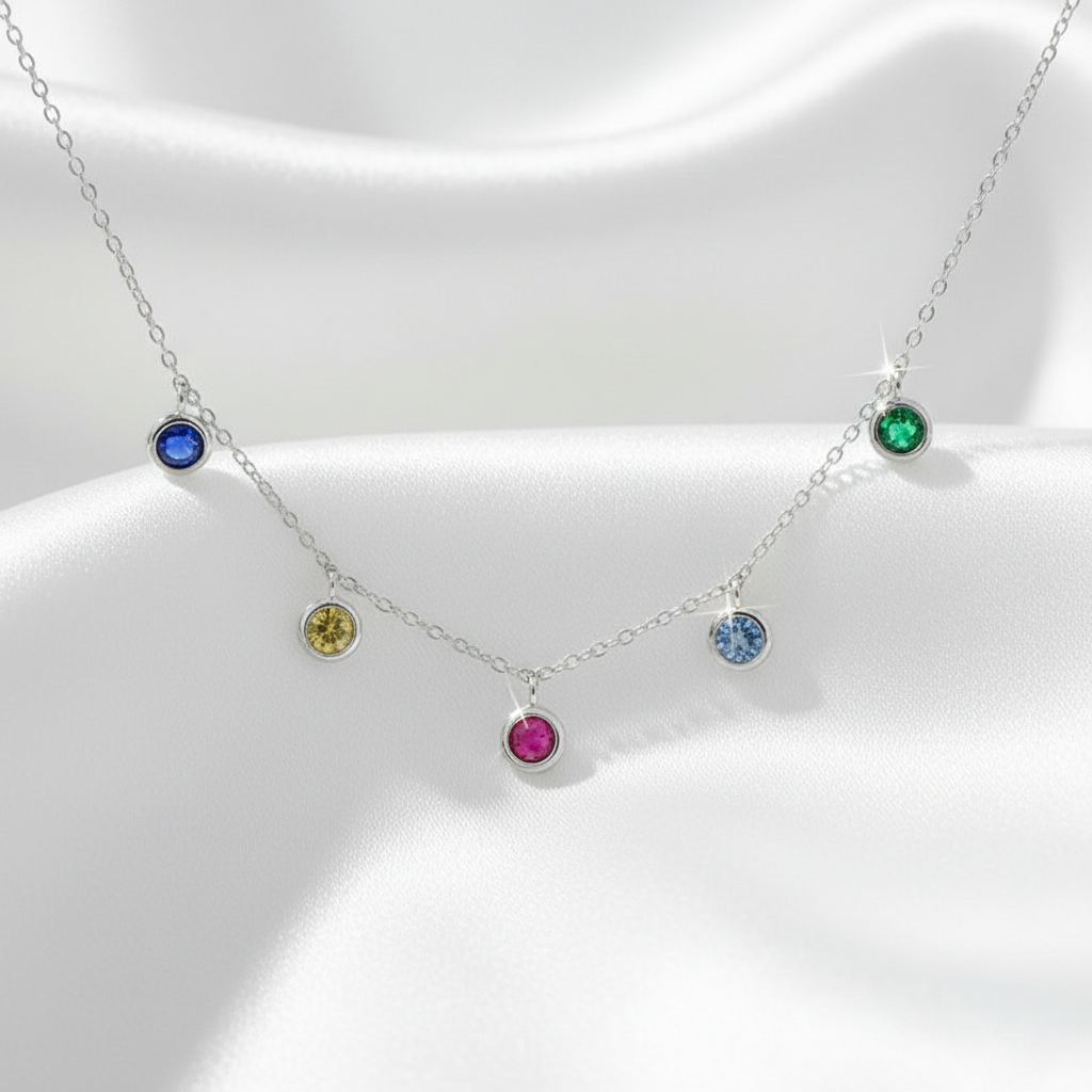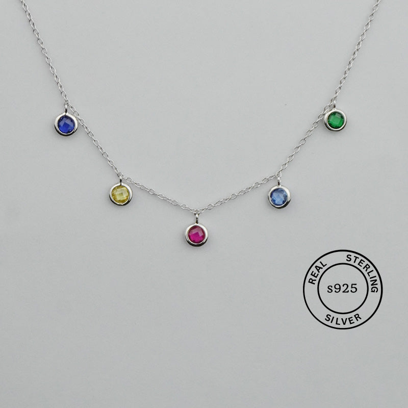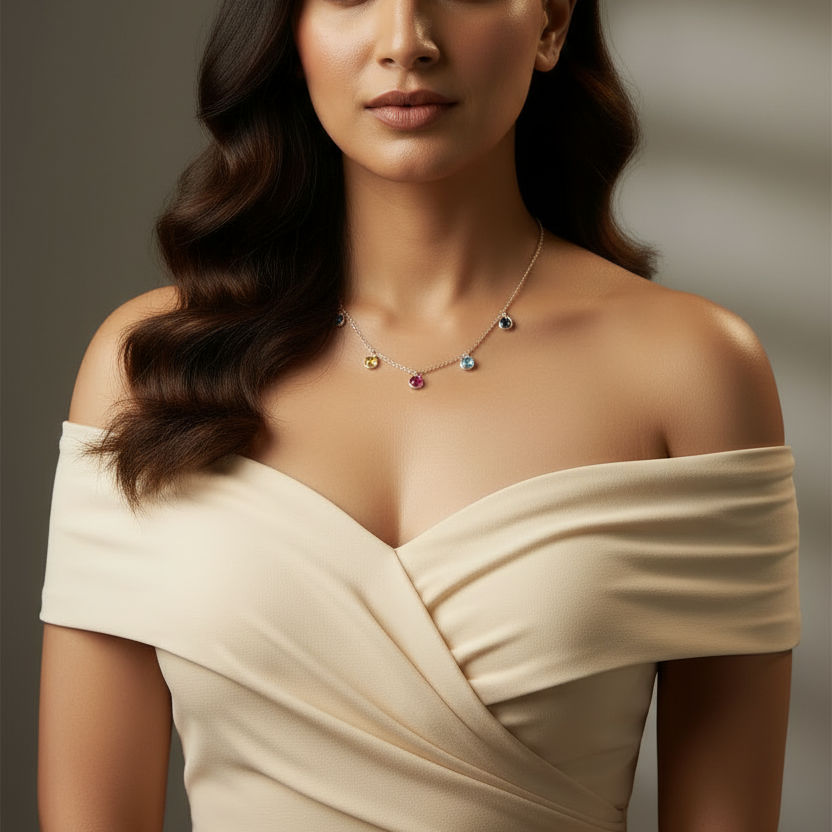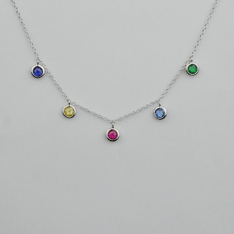 A graceful 925 sterling silver necklace adorned with vibrant multicolour gemstone drops that add a pop of joy and elegance. Lightweight, minimal, and perfect for everyday wear or effortless layering.