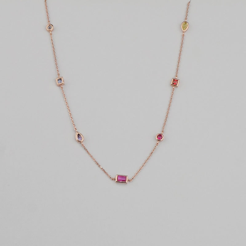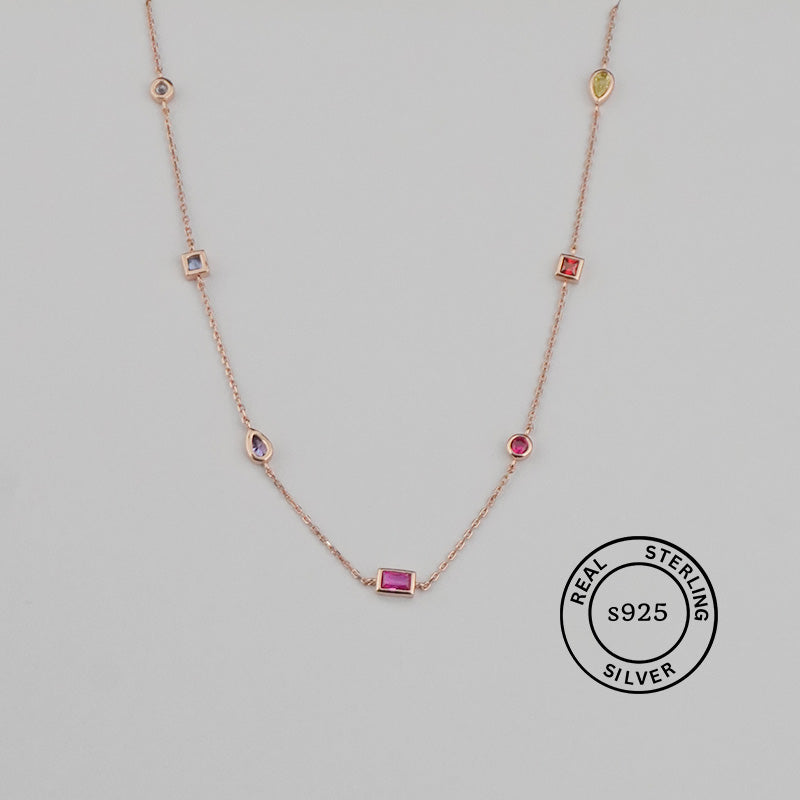 A refined 925 sterling silver necklace with a soft rosegold finish, featuring multicolour geometric gemstone accents for a modern, elegant look. Lightweight, graceful, and perfect for everyday sophistication or subtle festive styling.
