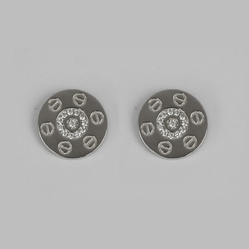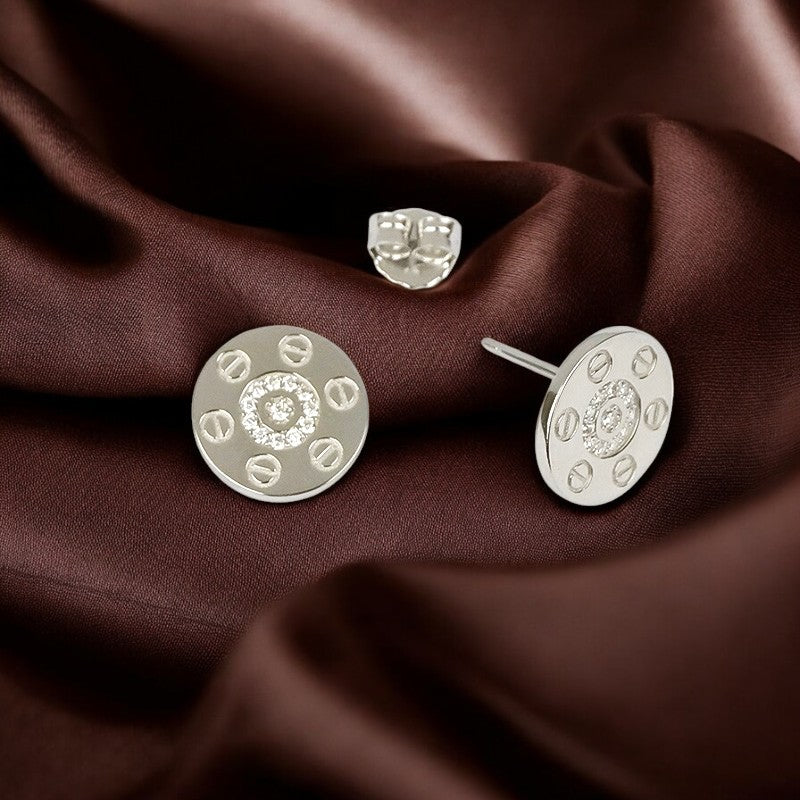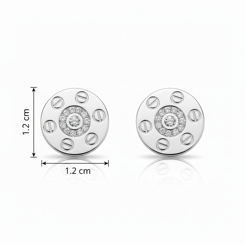These modern round stud earrings feature a unique screw motif with a sparkling cubic zirconia (CZ) center, crafted in 925 sterling silver. The sleek, industrial-inspired design adds a stylish edge to your everyday look.