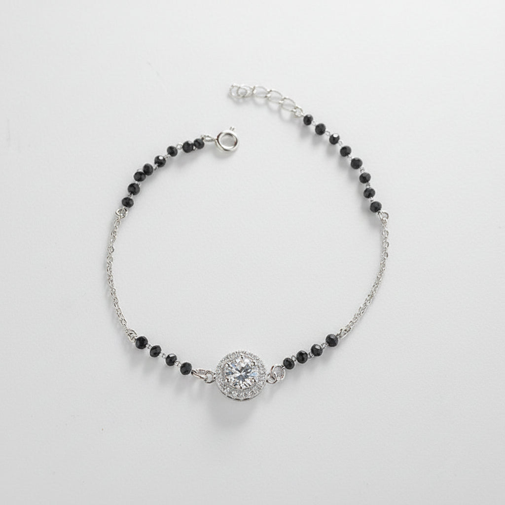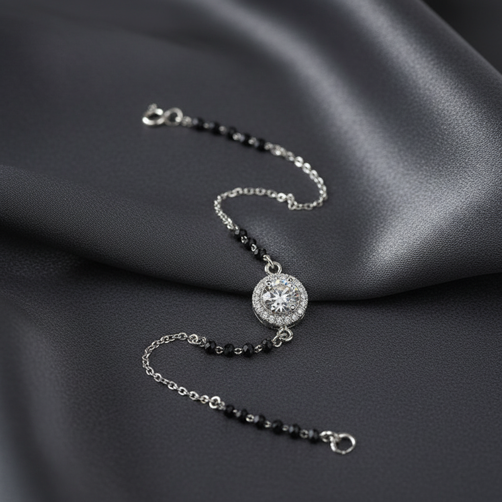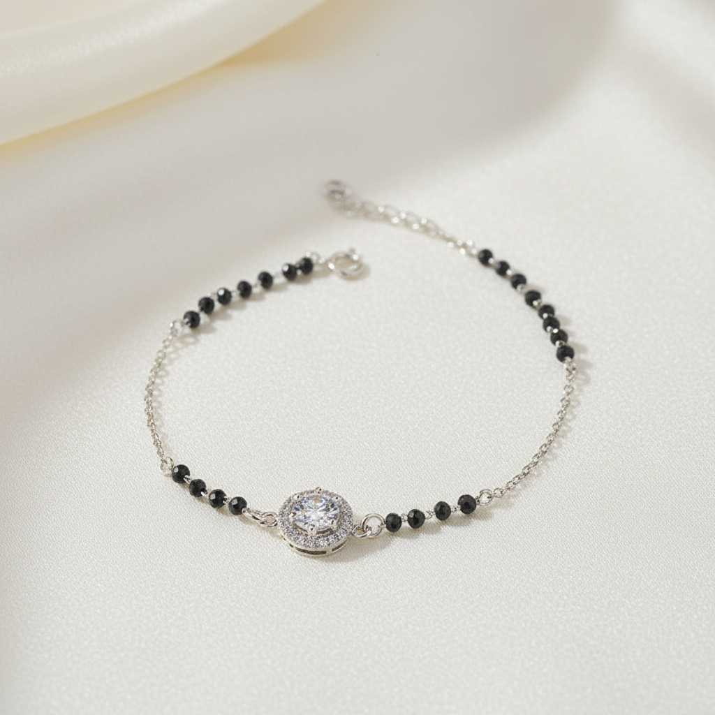 Crafted in pure 925 sterling silver with sparkling halo zircon charm. Classic black bead detailing inspired by modern mangalsutra styling. Elegant, meaningful & perfect for everyday luxury wear.