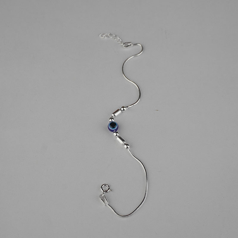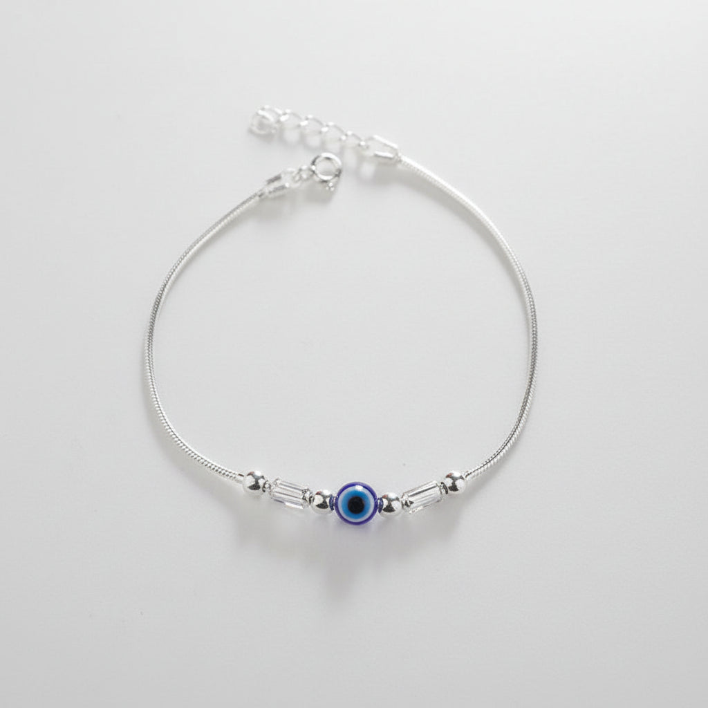Crafted in pure 925 sterling silver with sleek cylindrical bead accents. Minimal blue evil eye charm symbolizing protection & positivity. A modern everyday piece designed for effortless elegance.