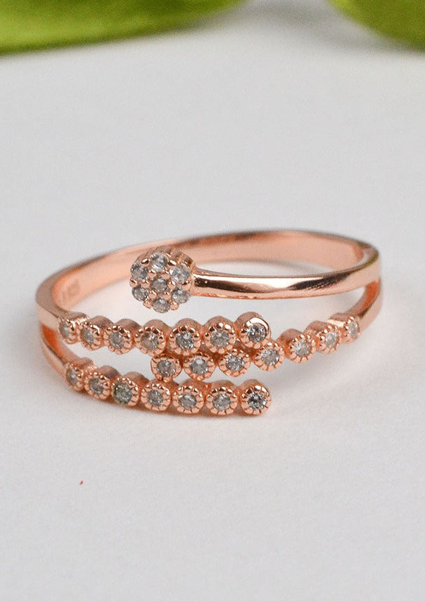 A captivating blend of stacked ring aesthetics in one exquisite piece. Embellished with shimmering zircon gemstones, this ring offers effortless style and versatility.