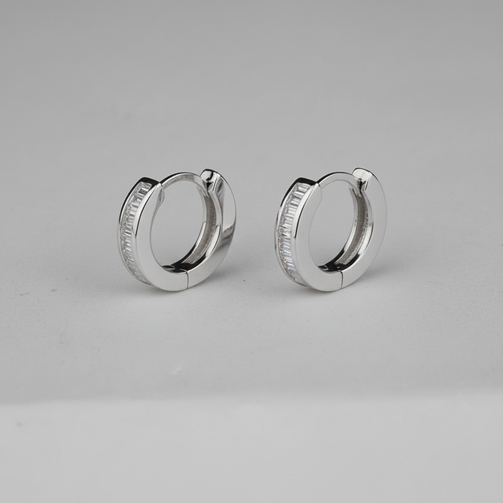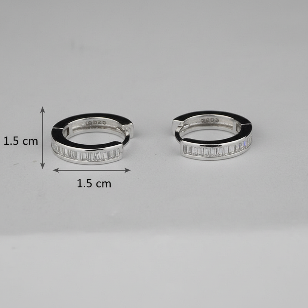 Crafted in genuine 925 sterling silver with sparkling baguette-cut crystals. Sleek huggie hoop design for a refined and modern look. Perfect everyday earrings that add effortless elegance.