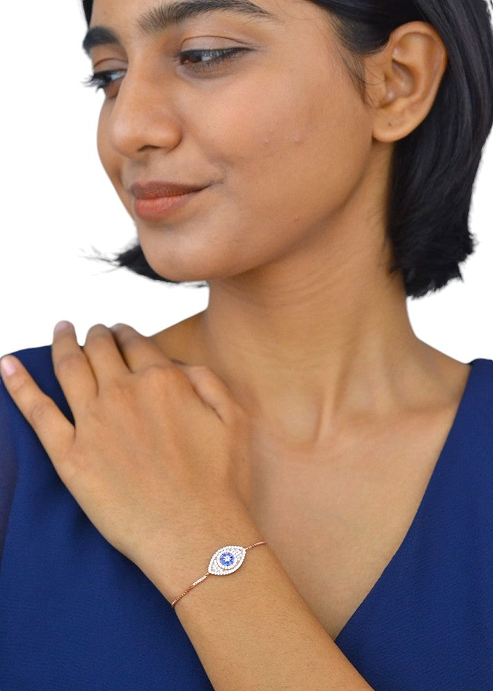 A 925 sterling silver evil eye bracelet featuring a captivating rosegold-plated charm, designed to ward off negativity. Elegant and stylish, it adds both protection and sophistication to any outfit.