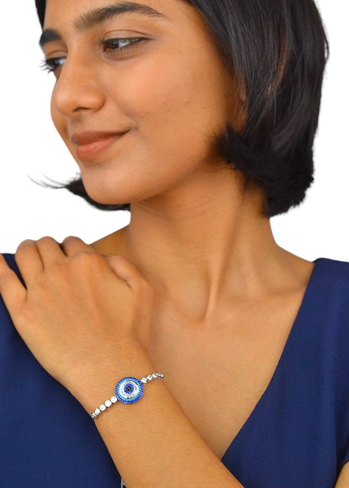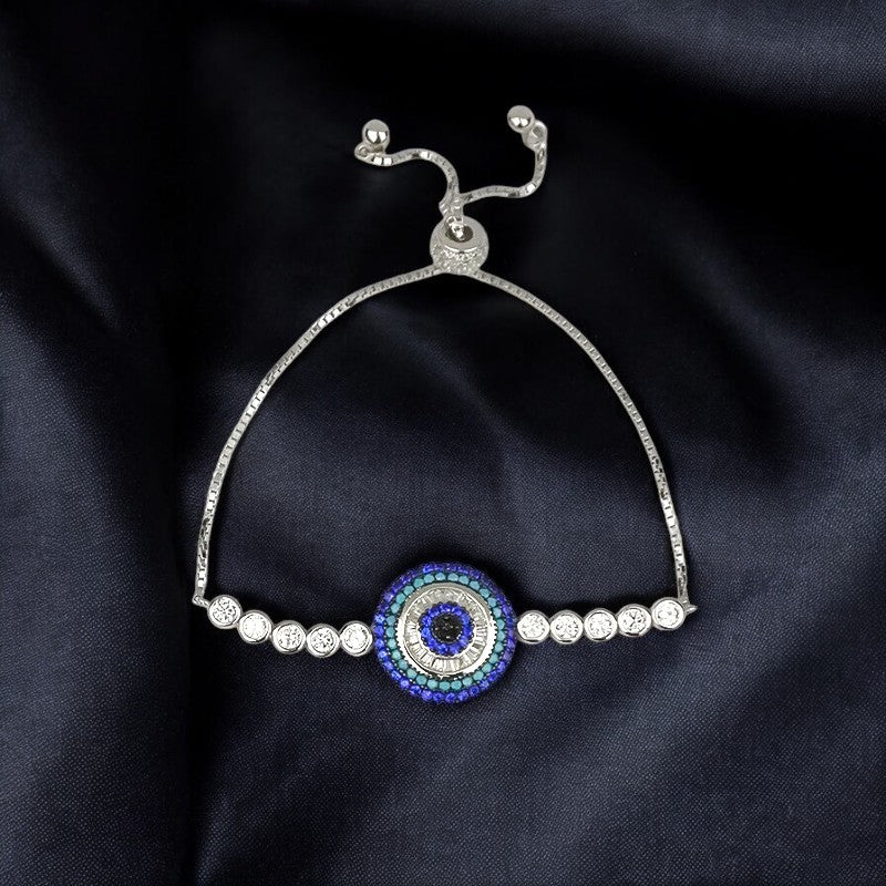 A stunning 925 sterling silver evil eye bracelet, elegantly adorned with shimmering zircon stones. This piece blends protection and style, offering a chic, symbolic accessory for everyday wear.