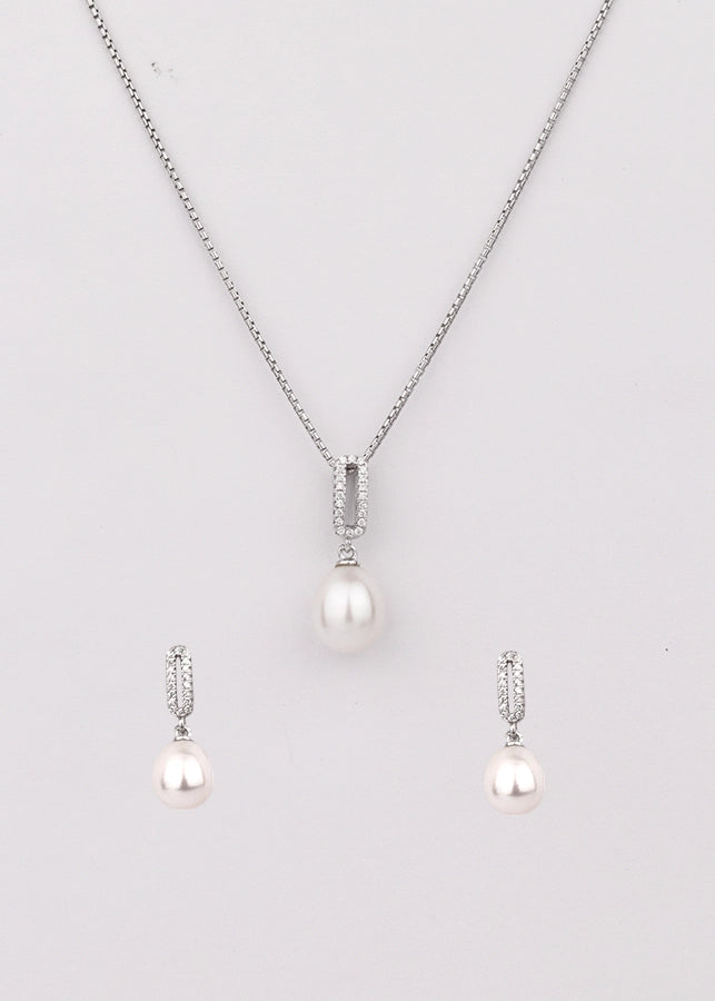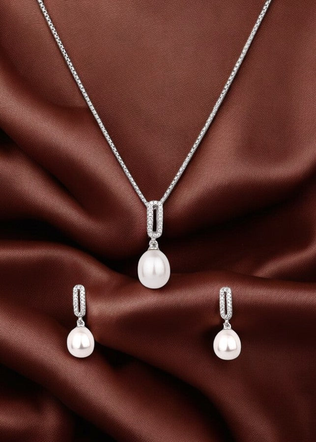 This exquisite 925 sterling silver pendant set features a graceful pearl drop, exuding timeless sophistication. The lustrous pearl is elegantly suspended from a delicate silver setting, making it a perfect accessory for any formal or special occasion.