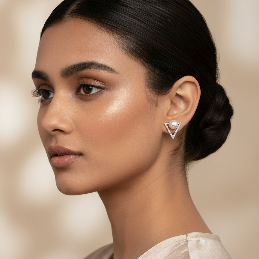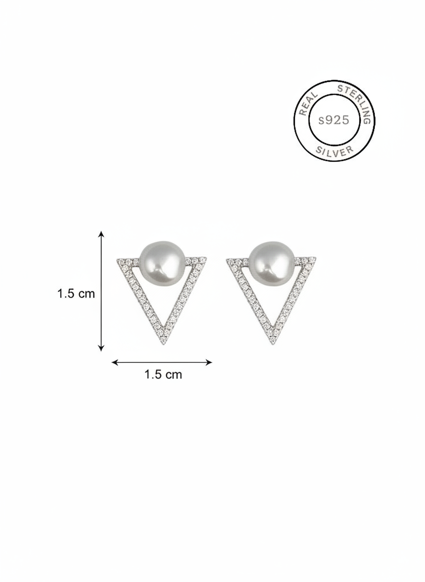 Elegant and timeless, these 925 sterling silver triangular pearl studs feature a delicate design with a lustrous pearl at the center. Perfect for adding a touch of sophistication to any outfit.
